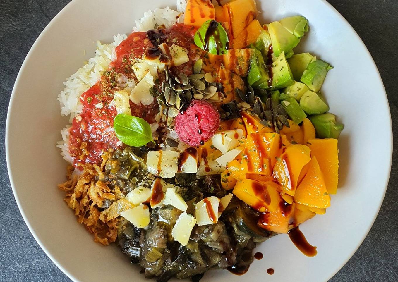 - Ajouter sur le côté la Poêlée de légumes, les fruits, les oignons crispy.m, les graines