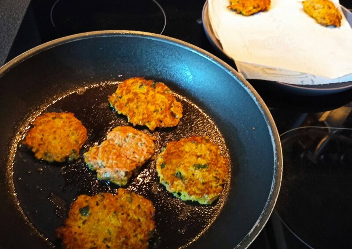 - Faire frire dans une poêle avec de l'huile sur feu moyen et laisser doré quelques minutes de chaque côté. Placer en suite sur de papier absorbant.