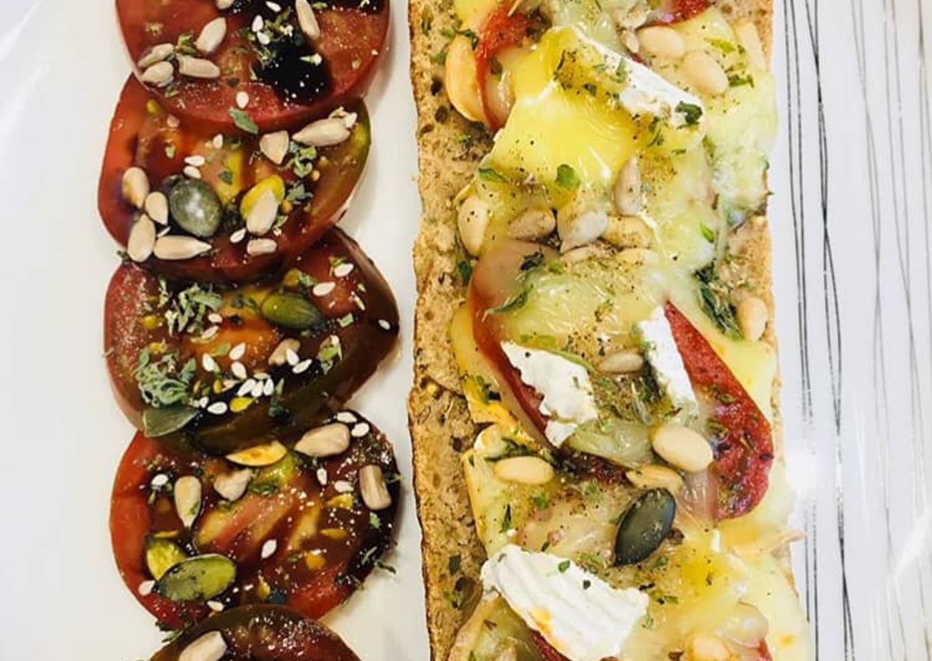 Parsemez de graines, de thym frais et séché à votre convenance. - Dégustez aussitôt avec une salade de votre choix ici avec une salade de tomates noire aux graines.