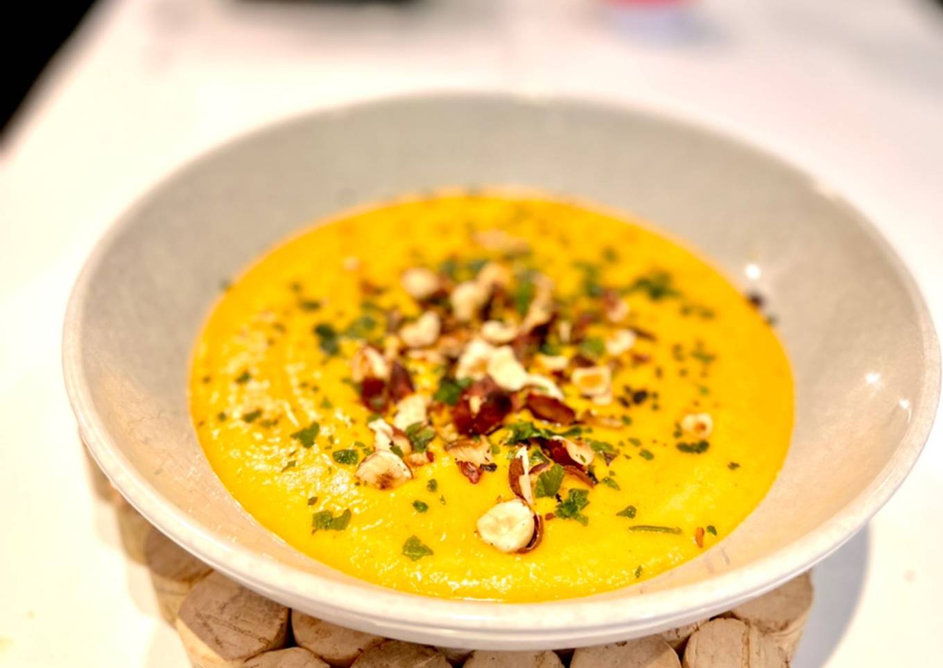 - Au bout de 25 mn.. mixer vos légumes avec un yaourt coco végétal sans sucre si besoin mettez un peu de crème fraîche, torréfiez à la poêle quelque noisettes, concassez les, servez avec les noisettes et de la coriandre fraîche ciselée