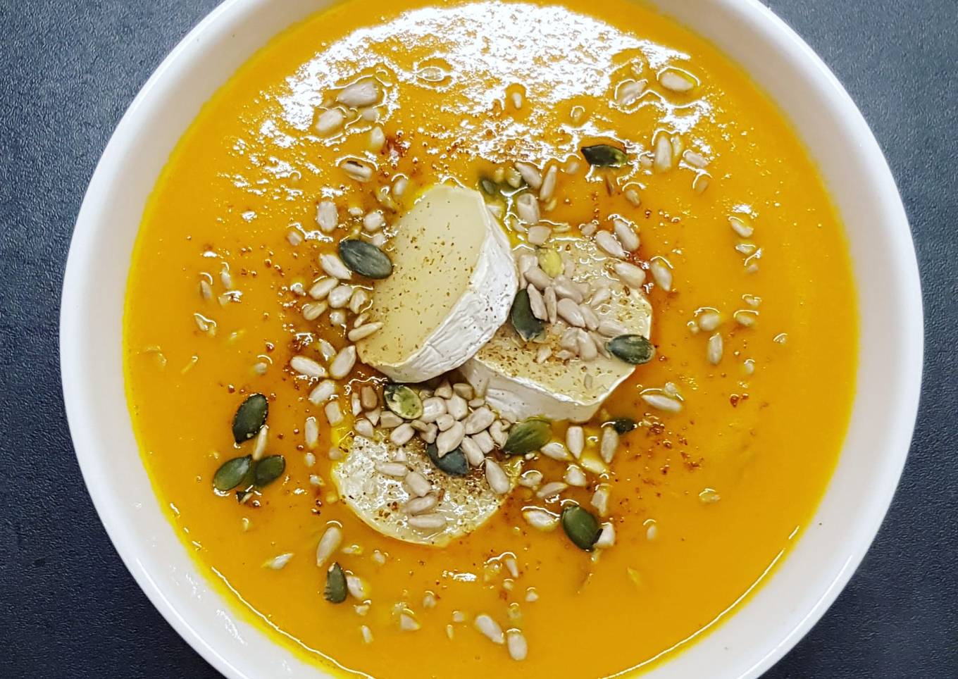 - Assemblage : la soupe dans un bol ou une assiette creuse puis installer les tranches de chèvre parsemer de graines et finir par la fleur de seul au curry