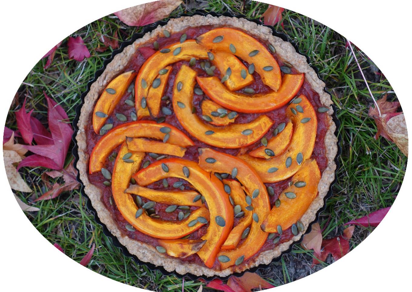 Une jolie tarte végétalienne, pleine de saveur. La pâte est croustillante, le potimarron est fondant, les graines de courge apportent du croquant... Miam :)